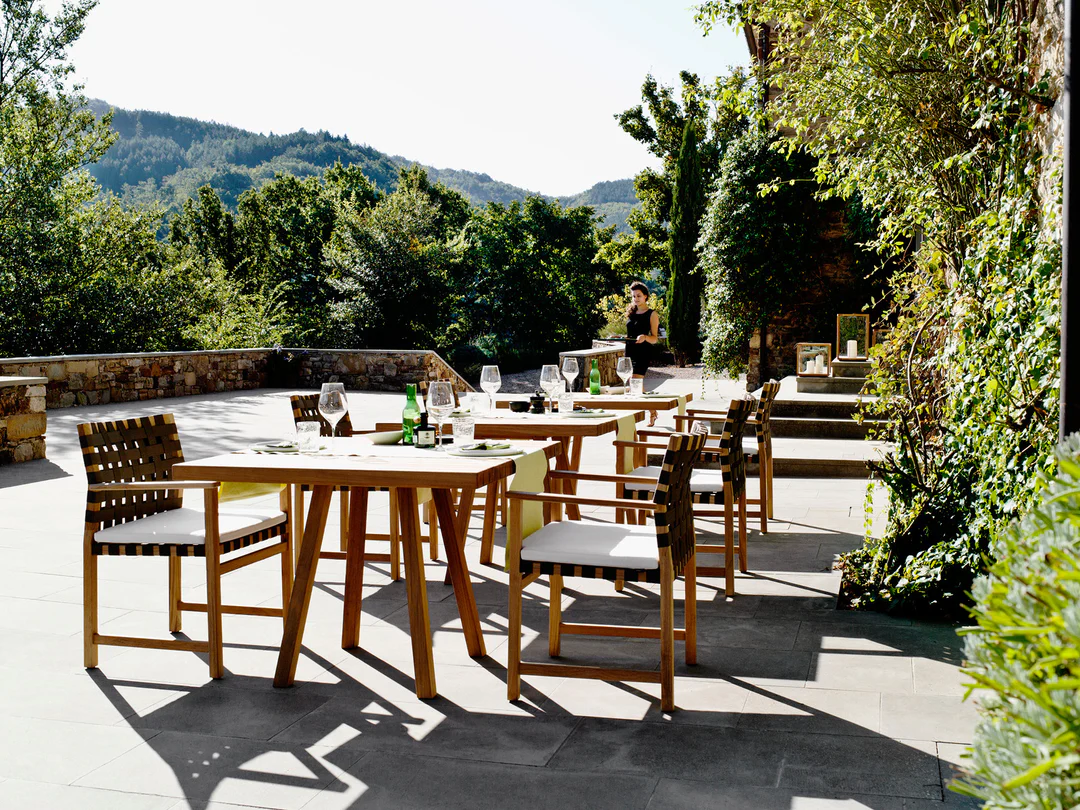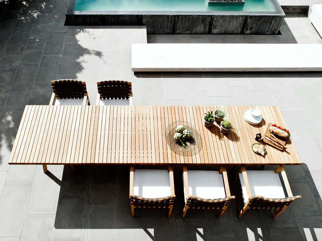 Natural Materials Focus: Highlights the warmth of natural wood (likely teak or similar durable hardwood) paired with light, textural weaving.