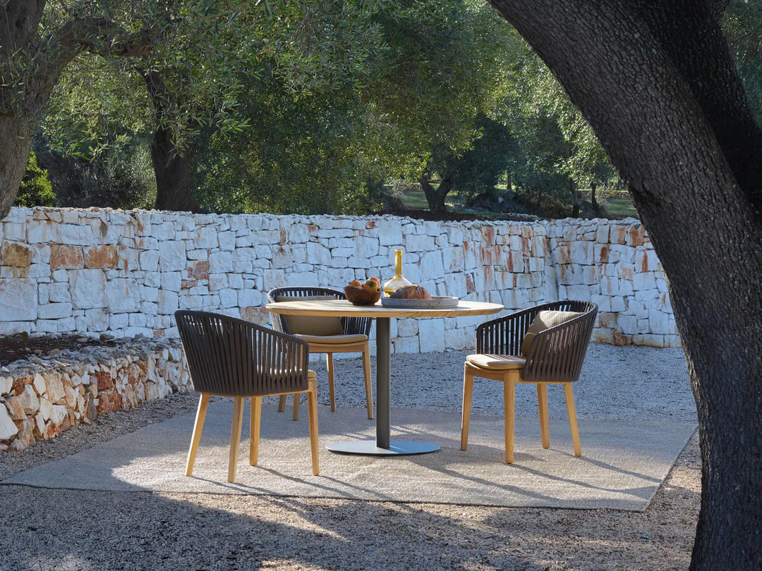 Mediterranean Vibe: The warm, rustic surroundings complement the furniture’s earthy and natural elements.