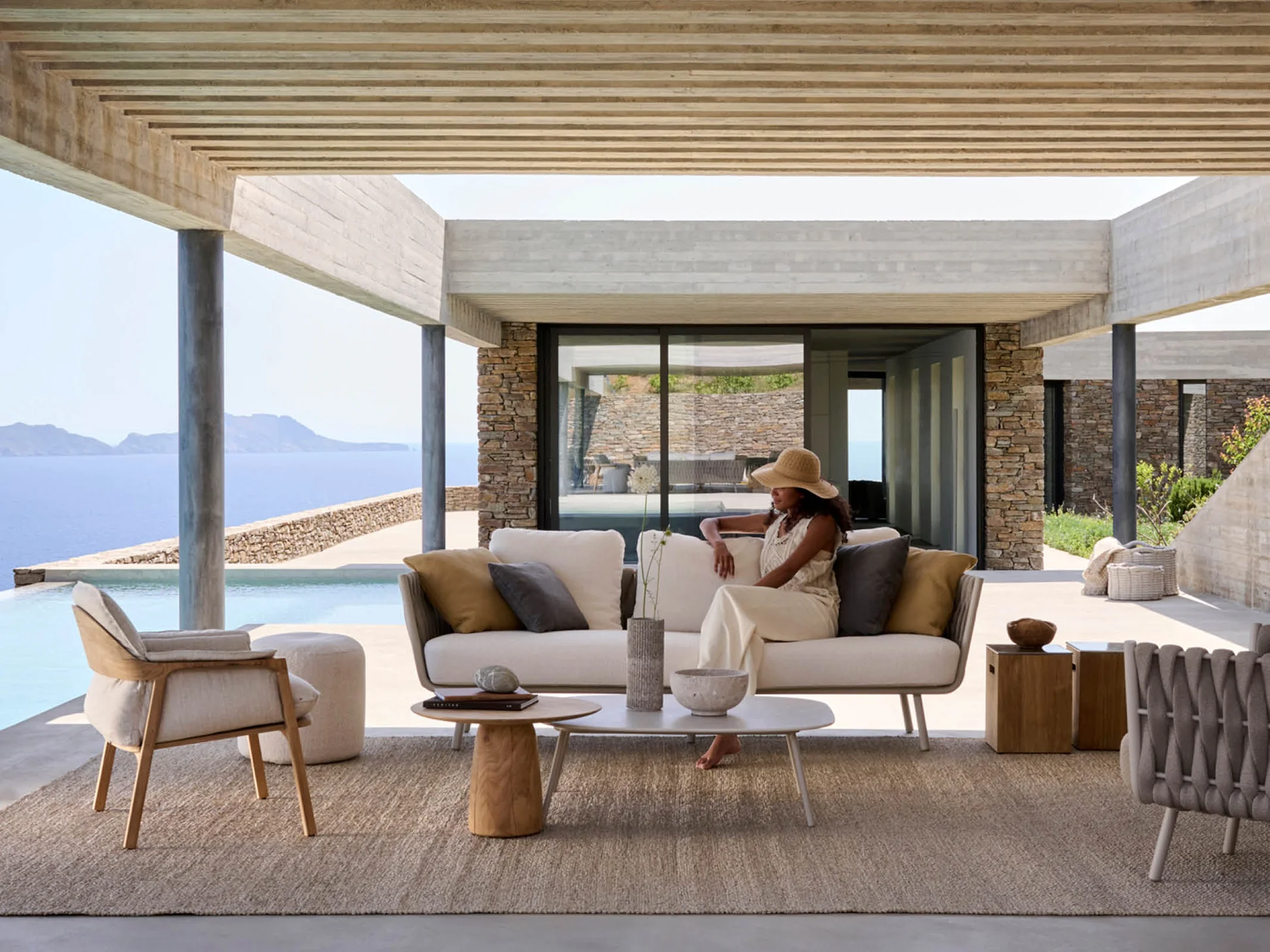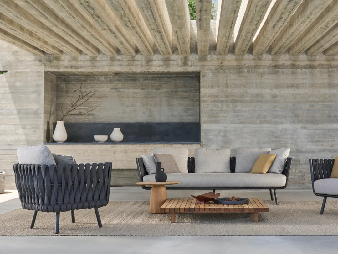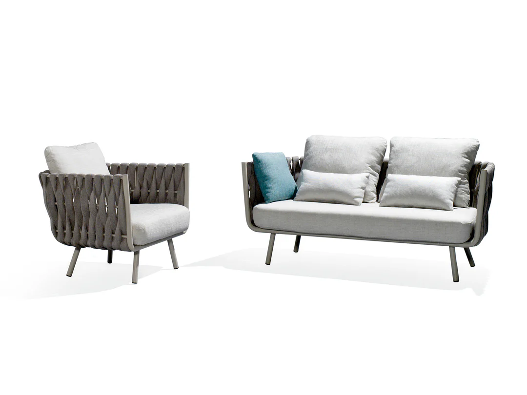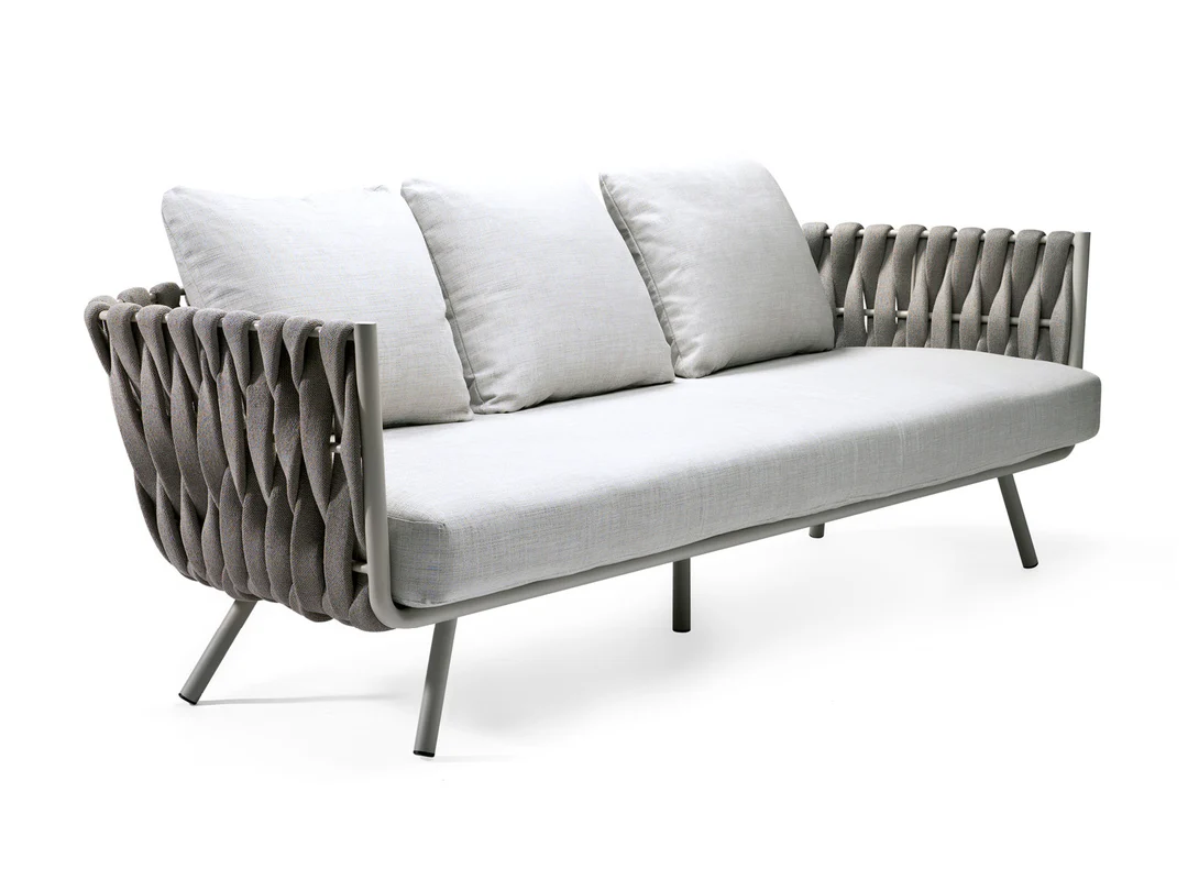 Contemporary Design: Sleek and modern outdoor sofa set featuring a stylish rope-woven frame and minimalist aesthetic.