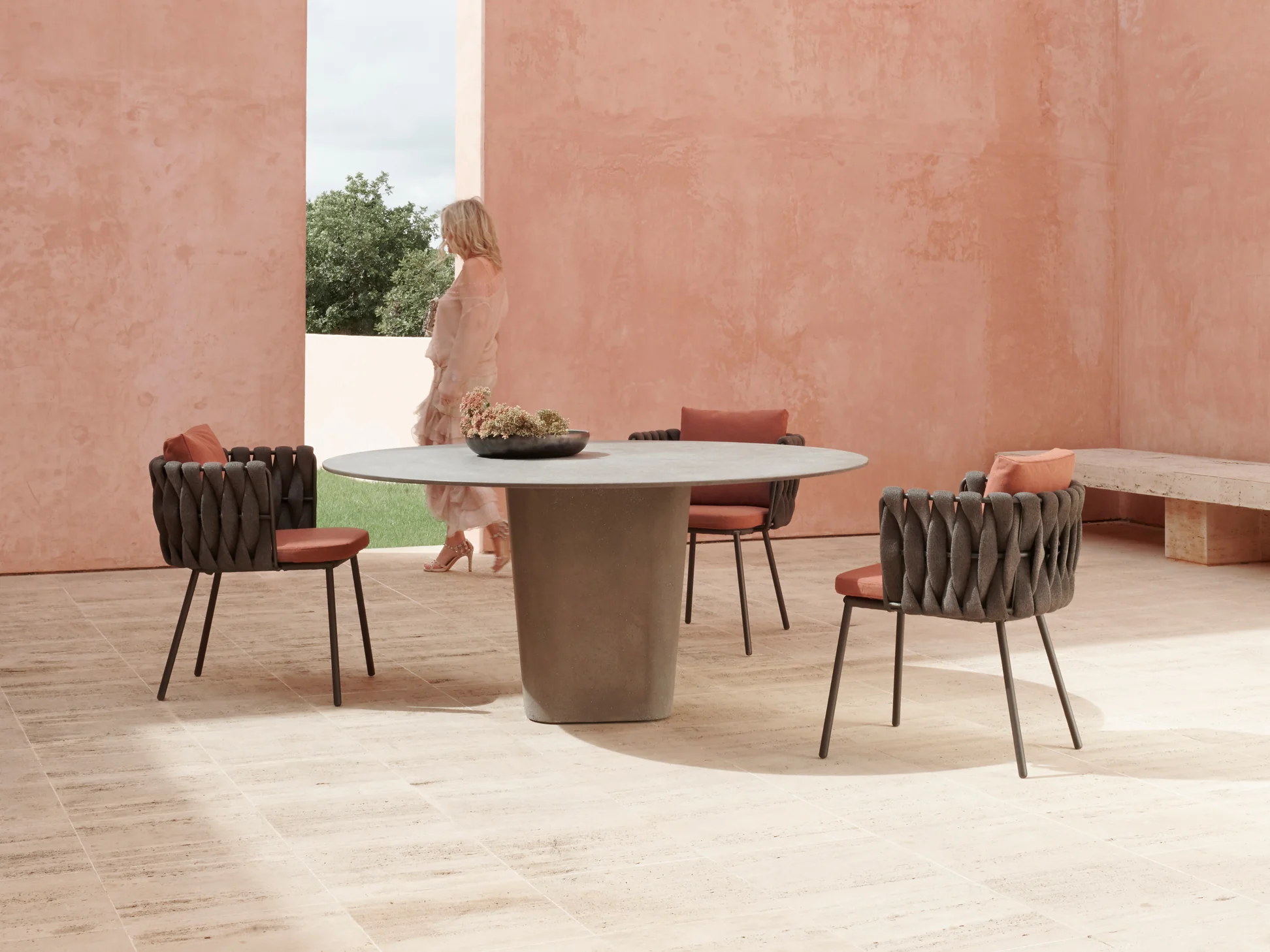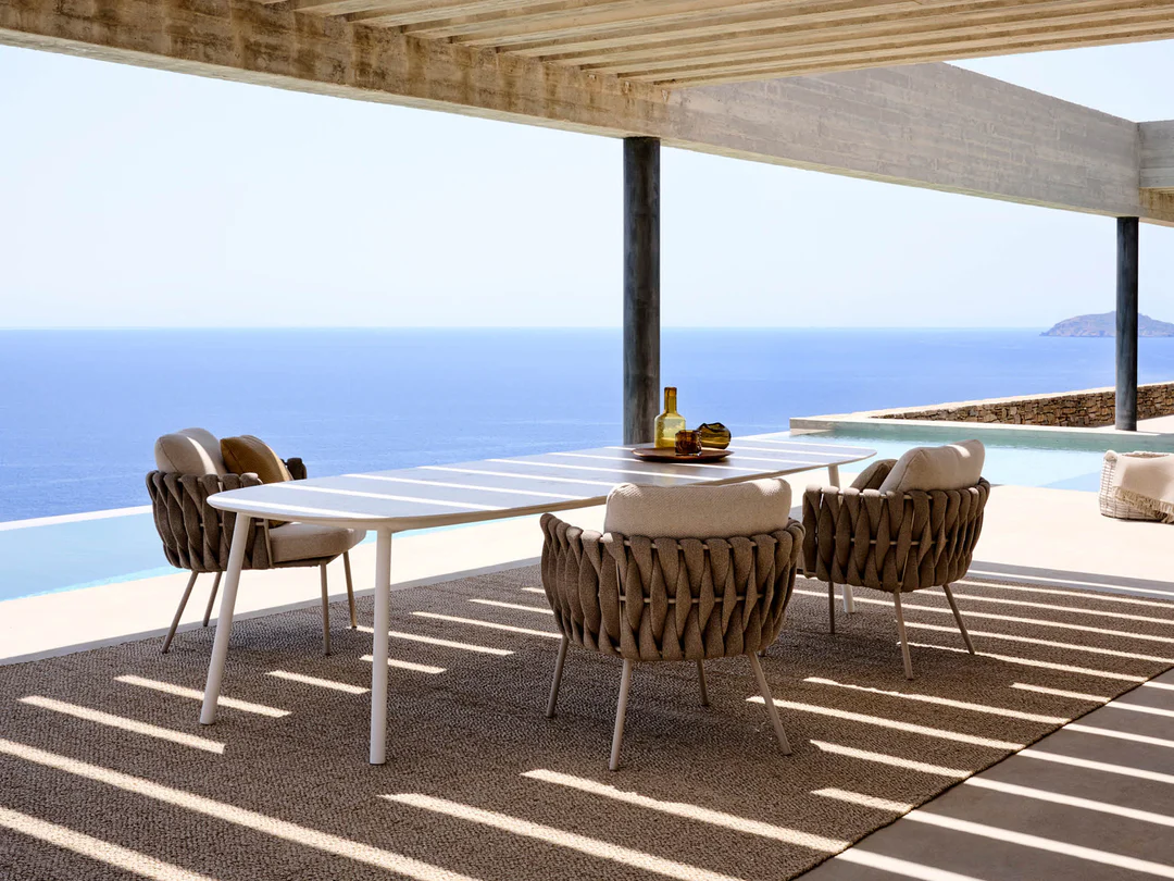Sculptural Modern Dining Set: Features a dramatic, architectural design suitable for high-end patios, courtyards, or indoor/outdoor transition spaces.