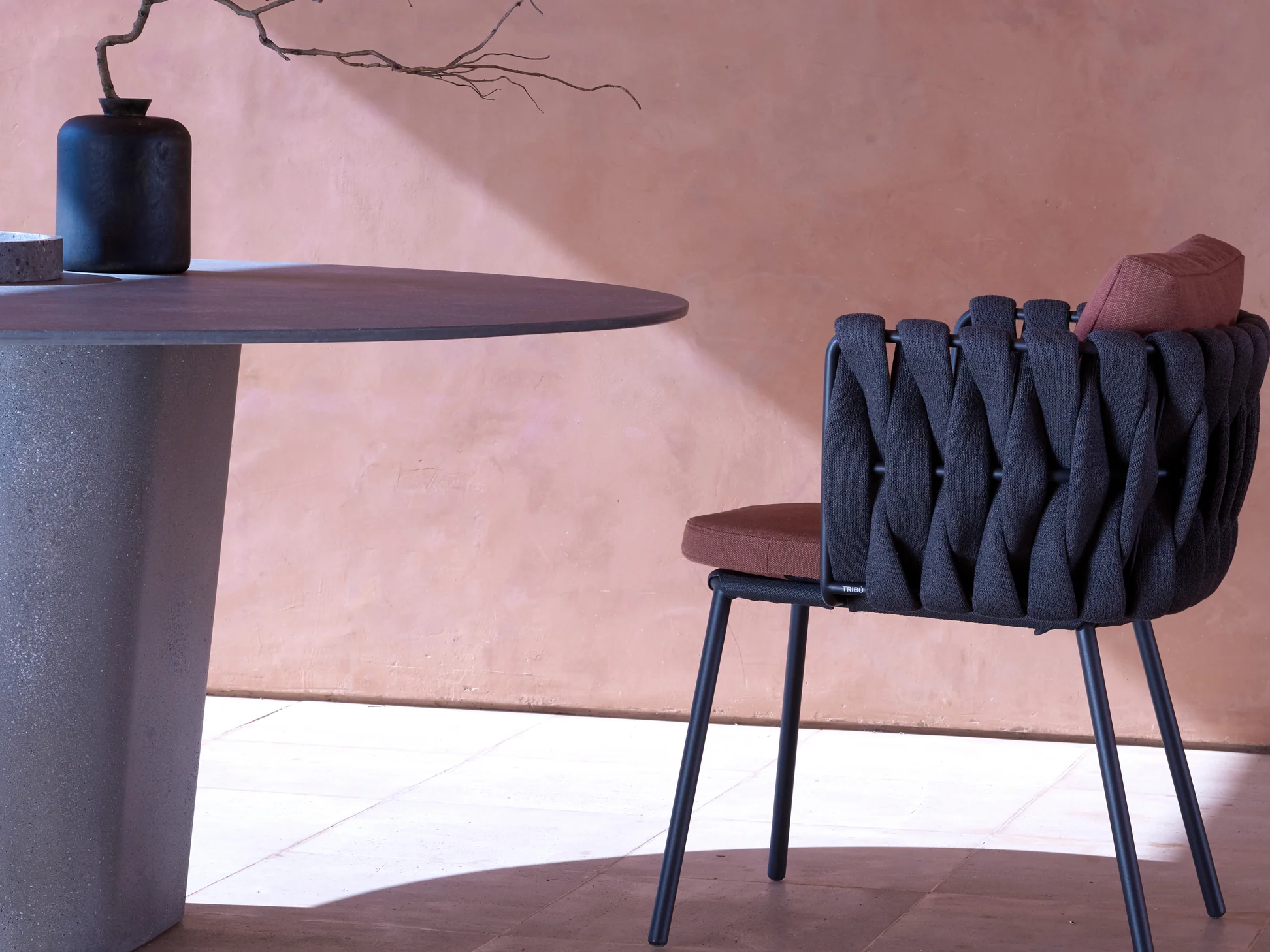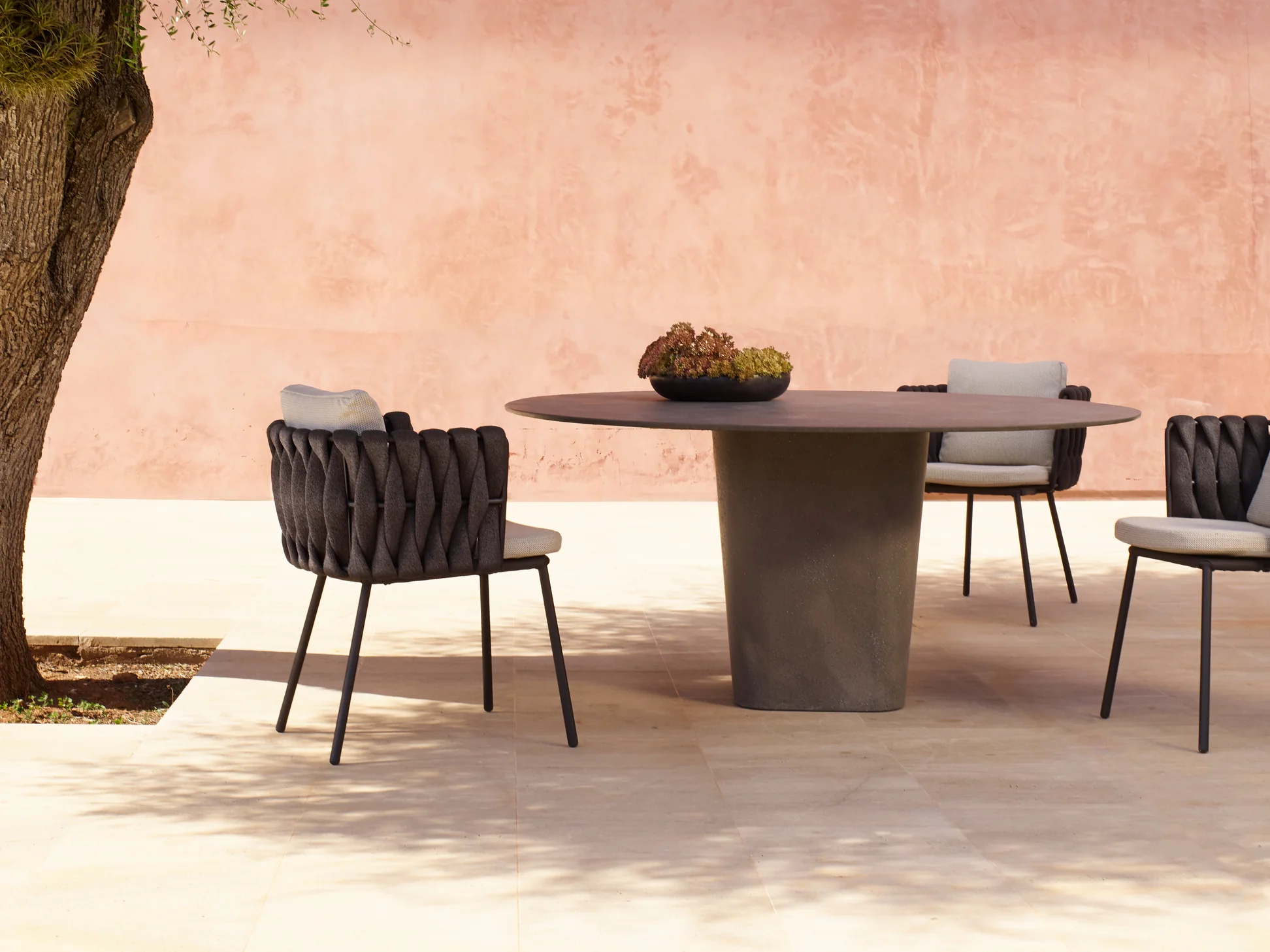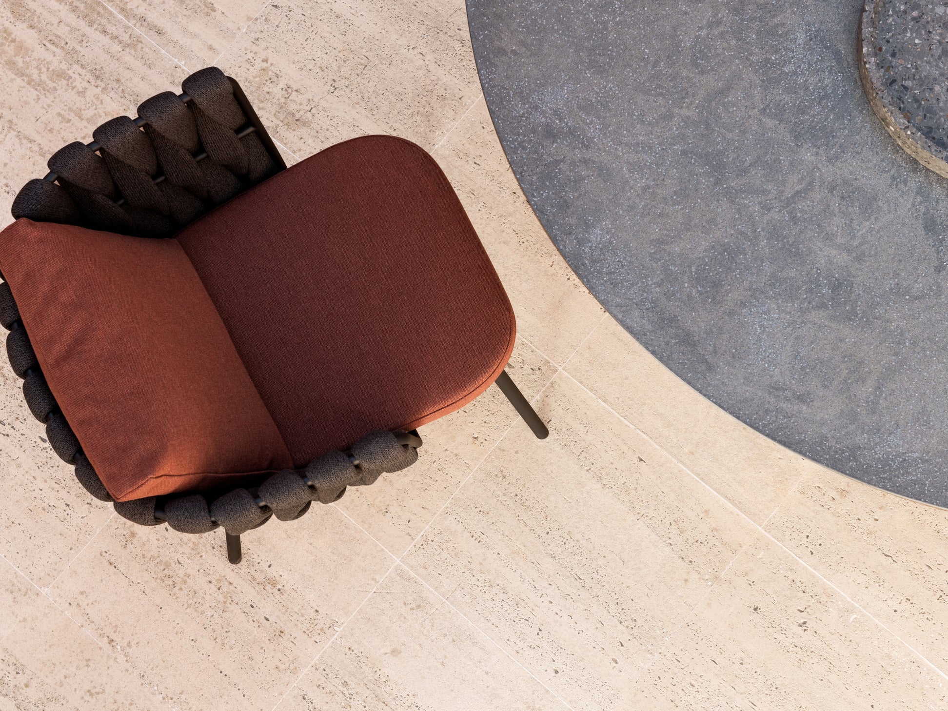 Unique Woven Rope Shell: The chair backs and arms feature an eye-catching, chunky, densely woven rope (likely synthetic all-weather rope) in a deep, dark gray or charcoal color.