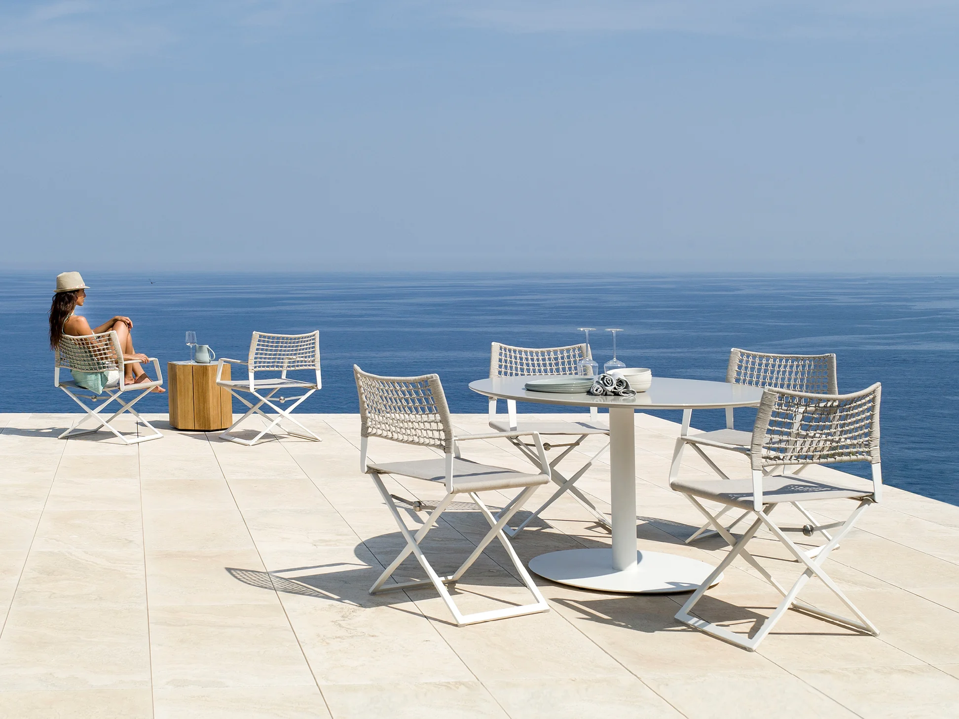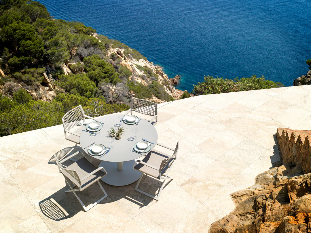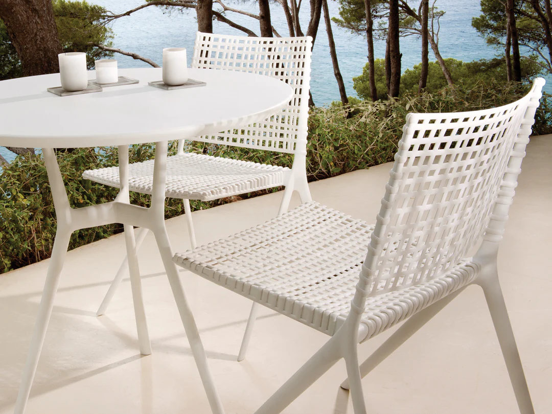 Modern Coastal Dining Set: Features a bright, minimalist style with a clean white finish that complements sunny, expansive outdoor settings.